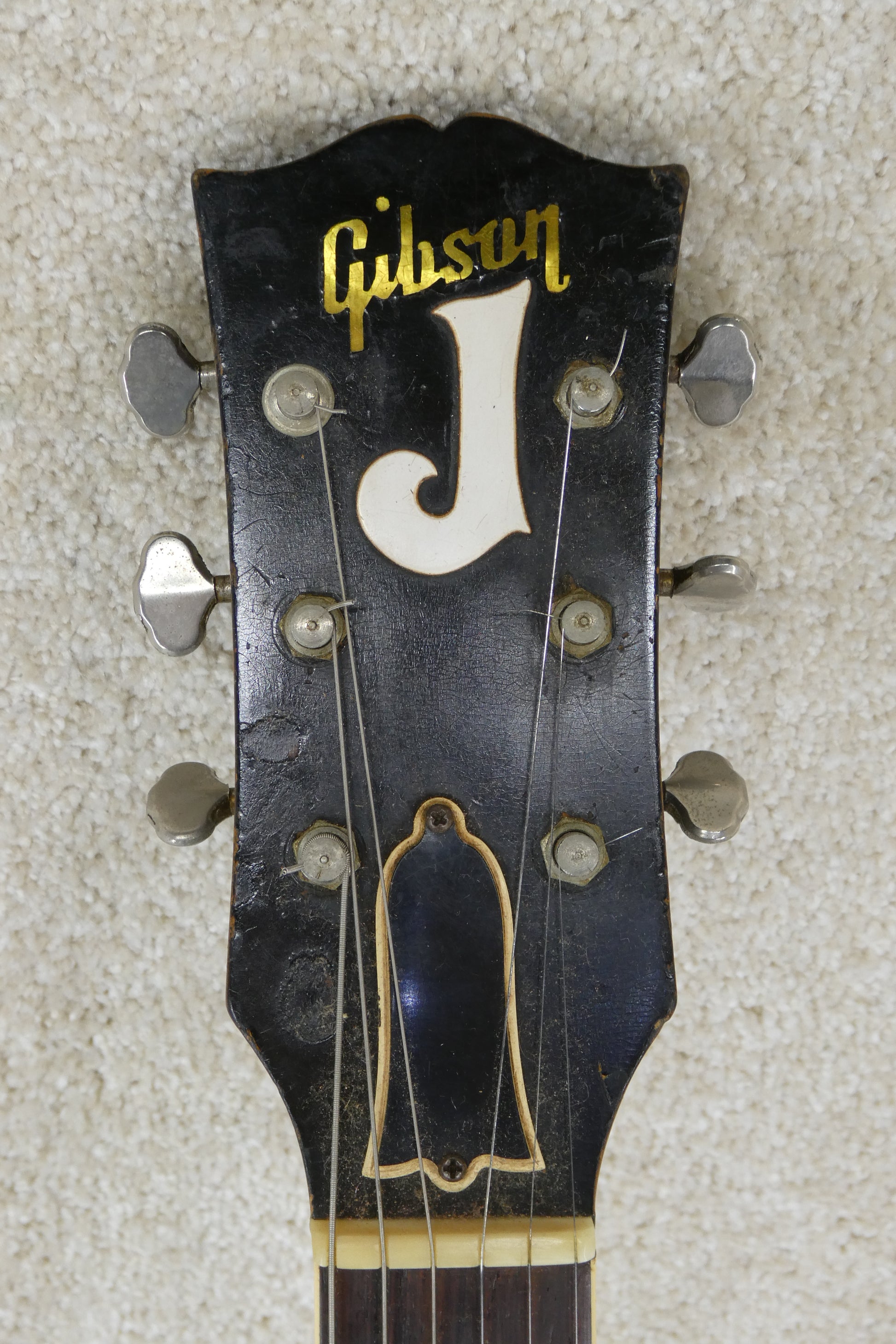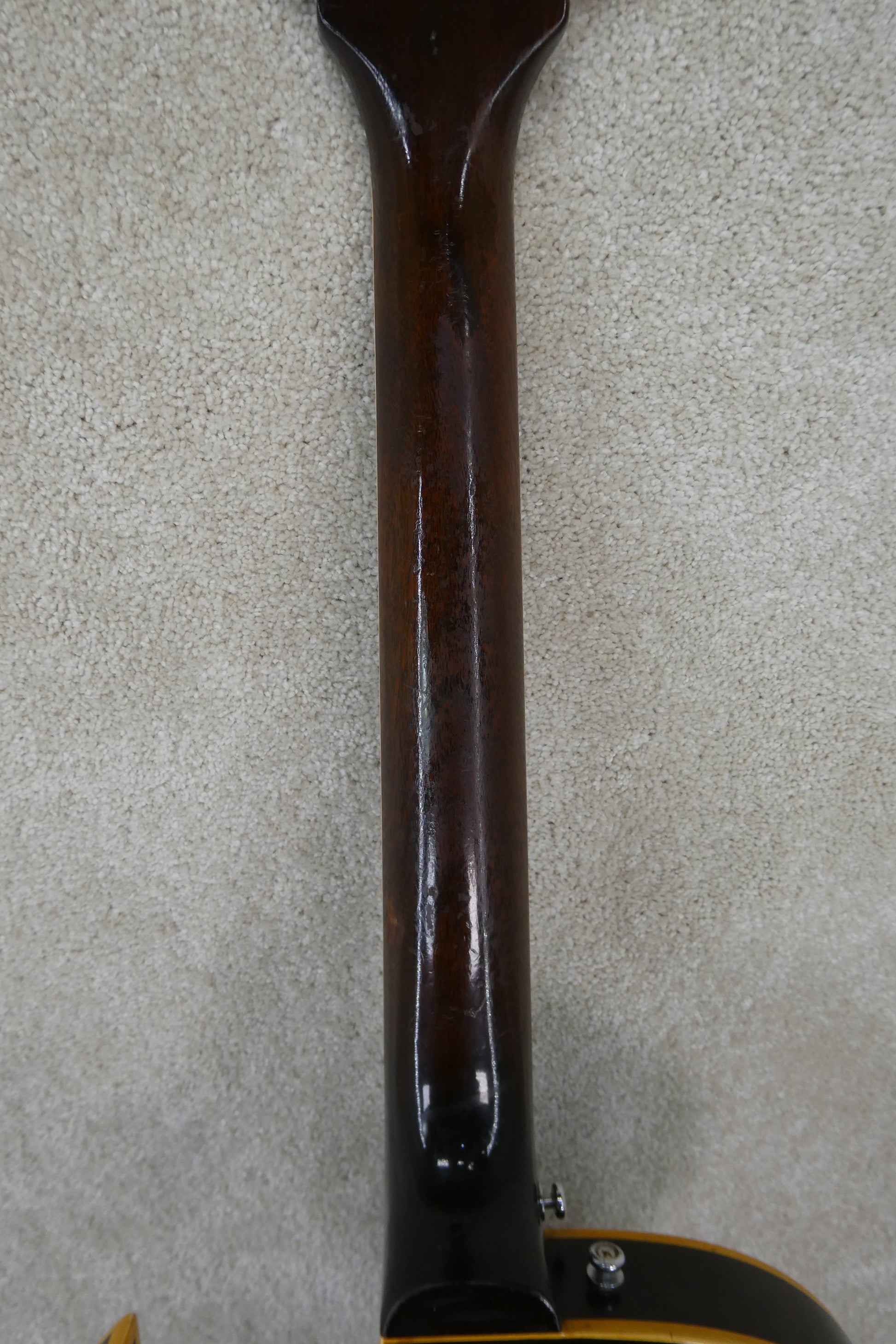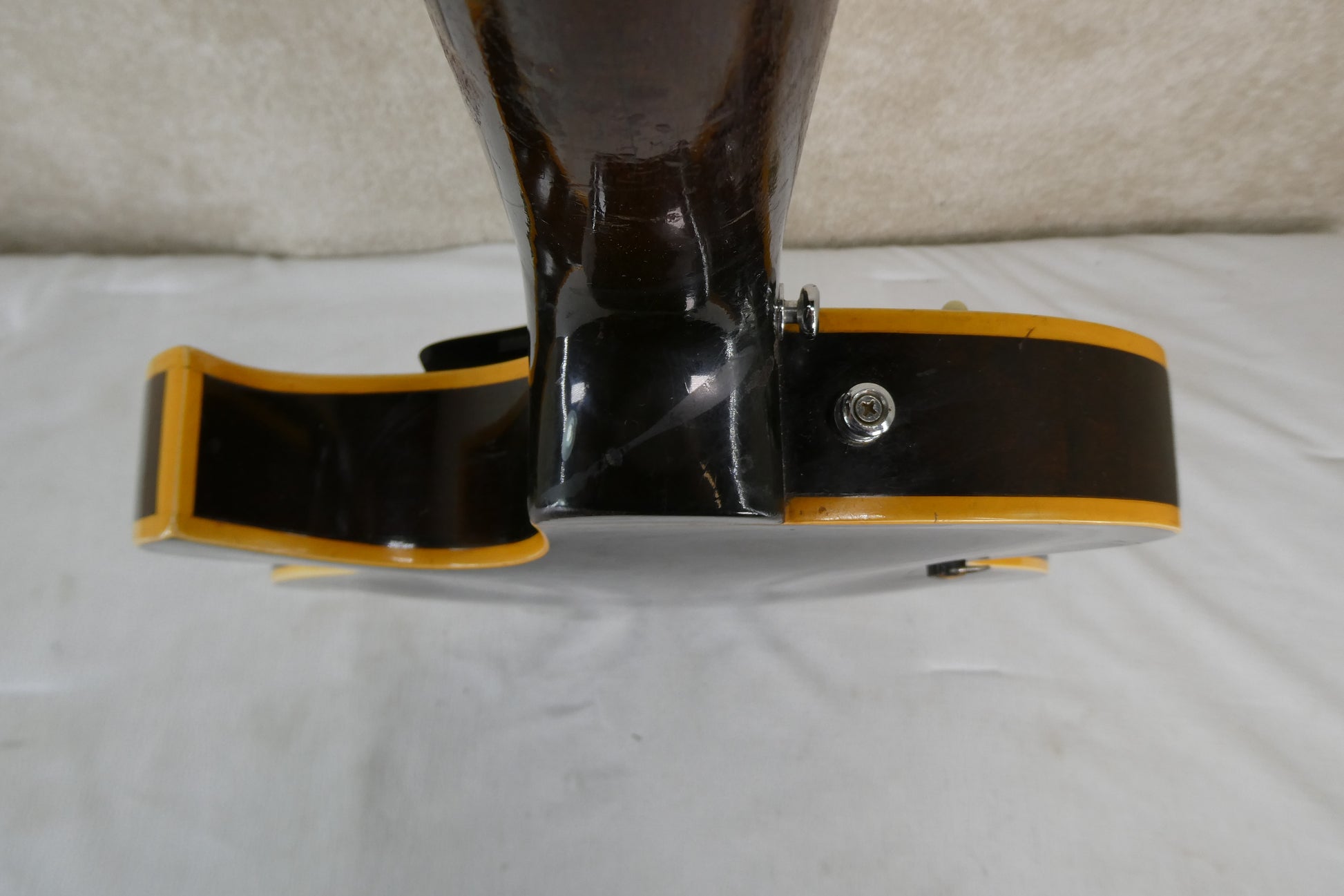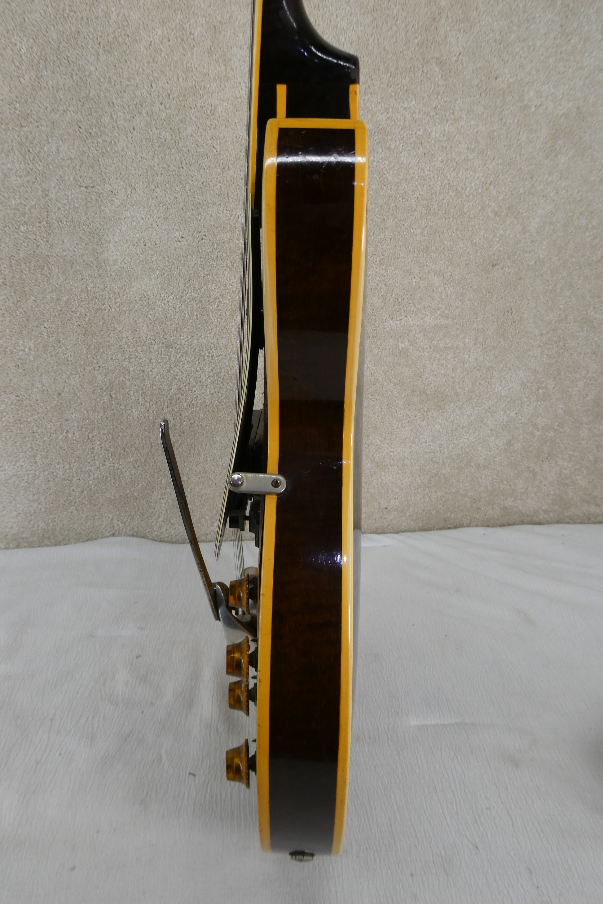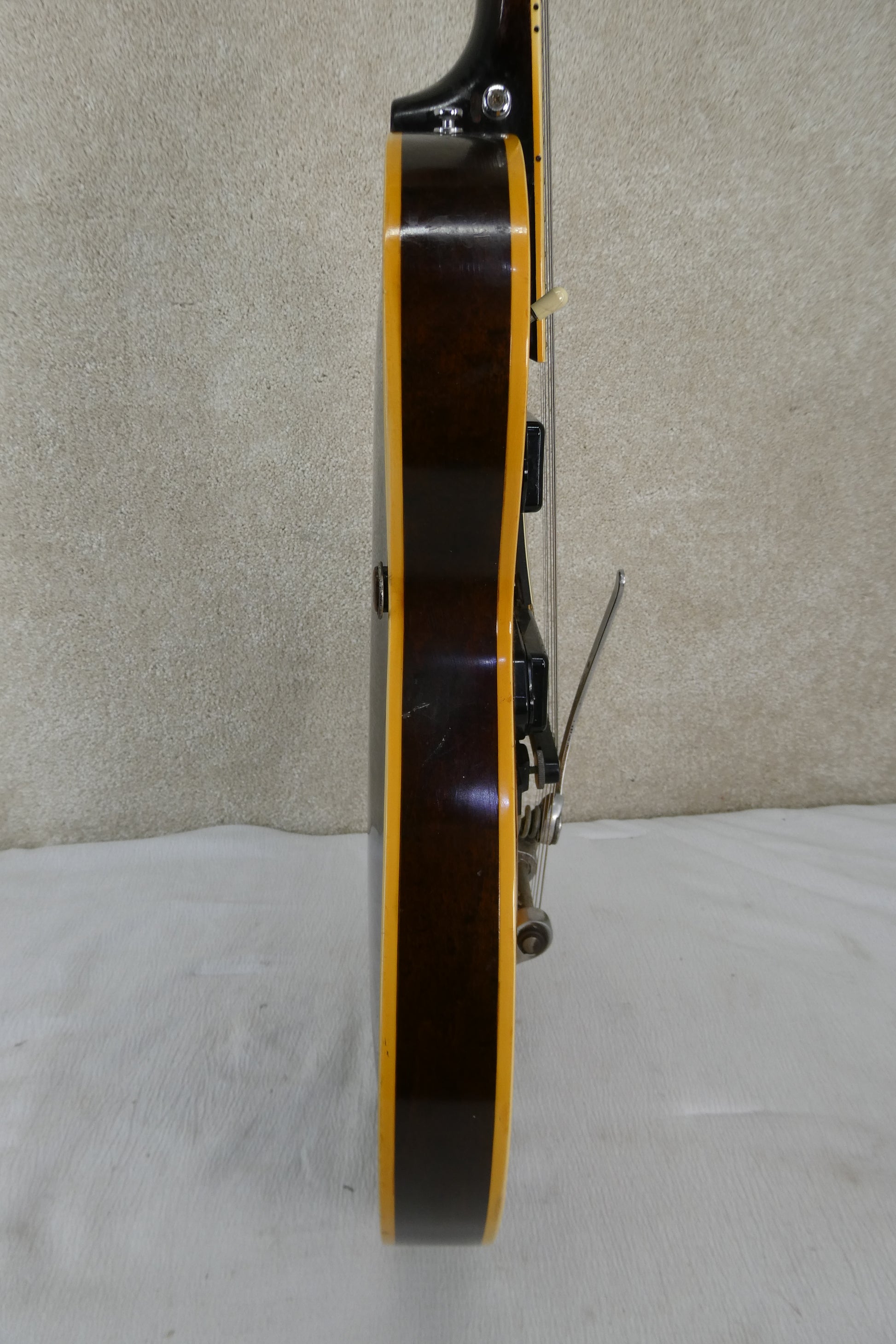 Gibson ES225TD 1957 w/OHSC USED Guitar has no breaks or cracks the pickups work and the controls work as well, but it is 68 years old, and this one came from Louisiana and may have been used by someone that played with Johnny Horton, that is not in question what is in question however does that J mean Johnny Horton. I have no idea why someone glued and screwed into the wood this loop hook for some reason and they added a strap button in an odd place ! The guitar sounds great and plays great, I played the One Woman Man lick on this and I be dang if it did not sound just like it !! The tuneamatic on this is unique it is not a Gibson but a custom made style rosewood platform ! This bridge may not have been available commercially and maybe a one off it works great though ! Also the Bigsby is not original to this guitar ! The Brown Lifton case is in great shape !