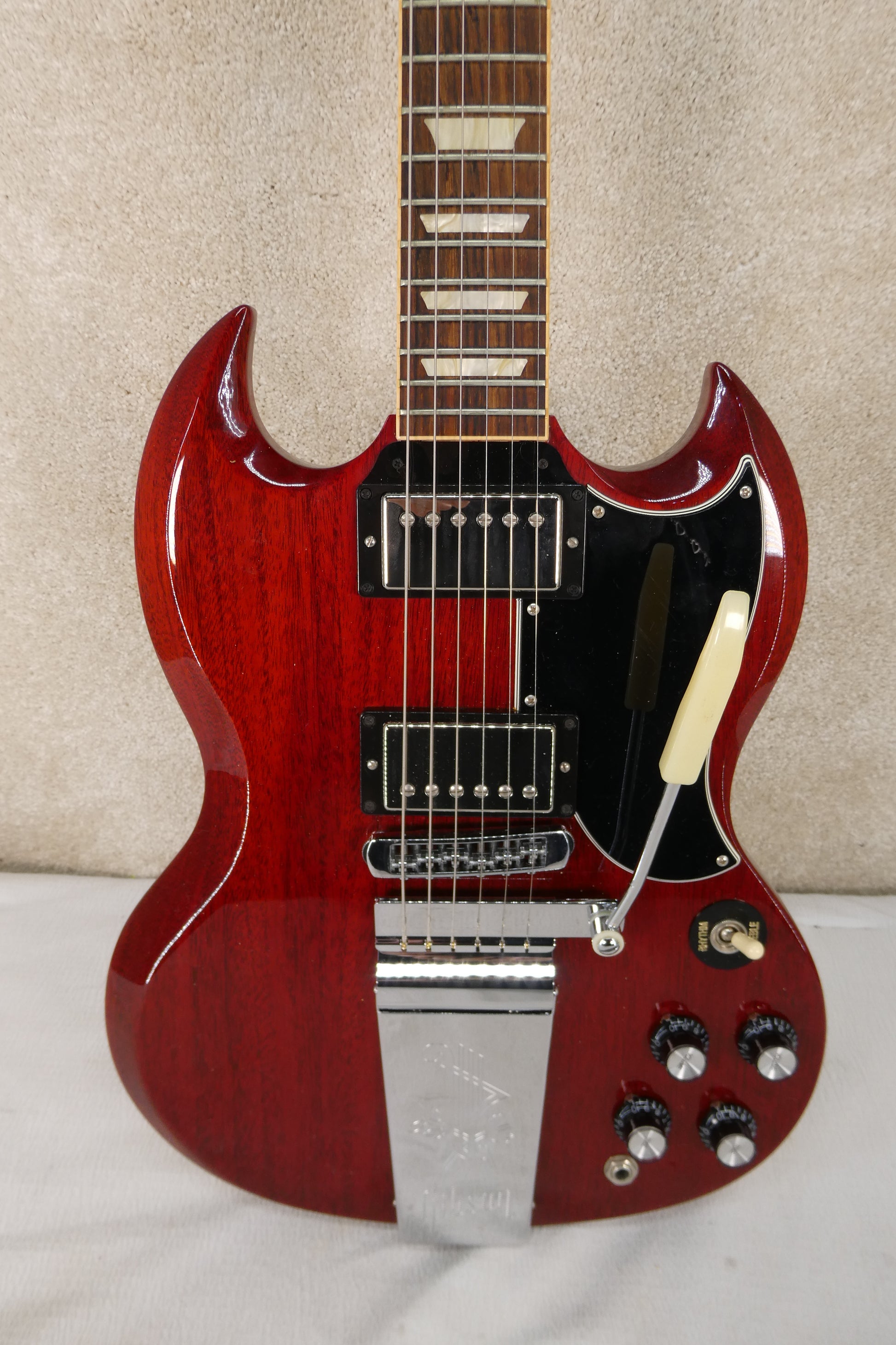 Gibson SG 2013 w/OHSC #131120446 This one has been upgraded with Gibson Burstbucker Pro and Pro Treble pickups and a schaller roller bridge, the original pickups and bridge will be included with purchase of this guitar ! Plays nice even though I do not think this guitar was played much at all it looks new ! Nice 7.0 lb weight !