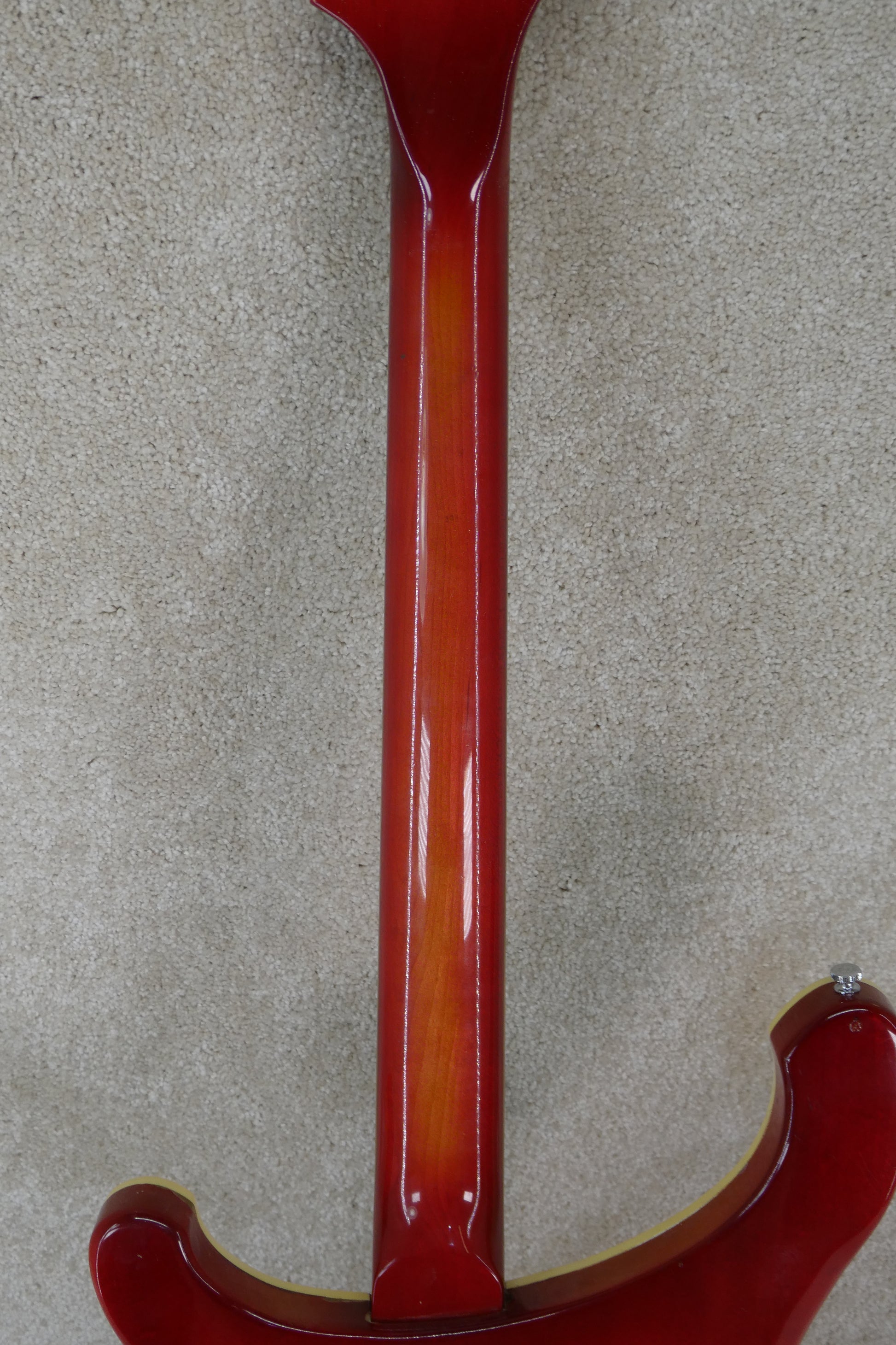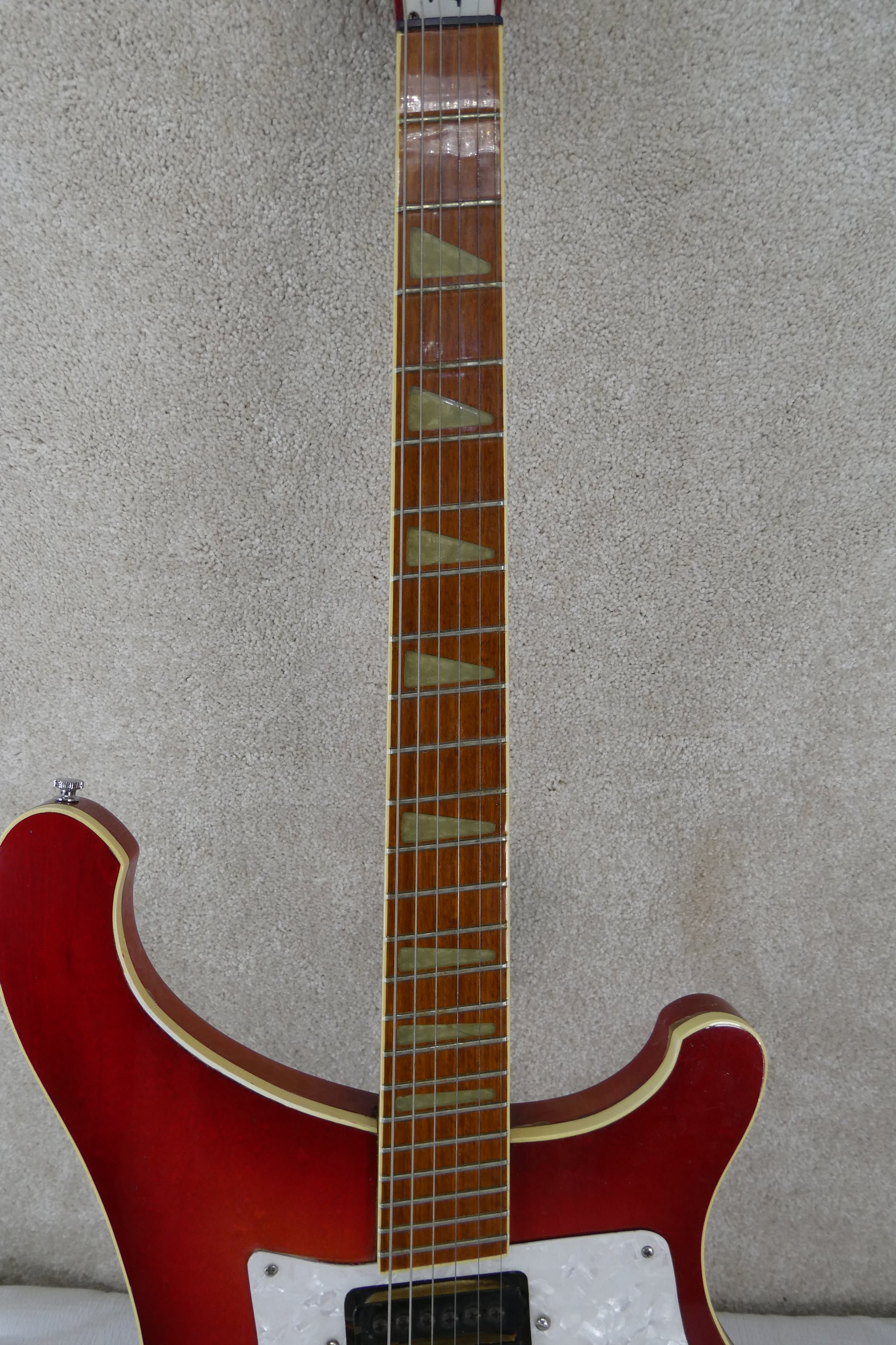 The Rickenbacker 481 Slant Fret is a distinctive electric guitar known for its angled frets , which tilt slightly toward the guitar's body, along with a matching slanted nut, bridge, and pickups, to provide a more ergonomic and comfortable playing experience. Produced between 1974 and 1979, it also features a pickup phase reversal switch and two humbucker pickups, offering a unique sound and a highly unusual design for its time. We do not have the pickup covers and apparently, they are not available!